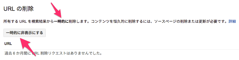 現在は、「一時的に削除します」「一時的に非表示にする」というように、URL削除ツールの動作を正しく表す表現になった。永久に削除する機能だと間違う人はほぼいなくなるだろう。