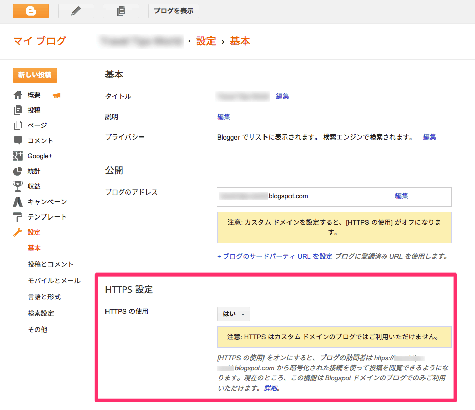 今のところは標準の blogger.com のドメイン名で運用しているサイトでのみHTTPSを利用できる。独自ドメイン名では利用できない。