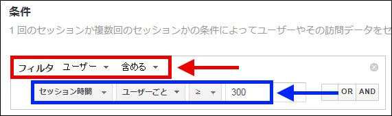 次に「合計サイト滞在時間が5分以上あった」という条件は、「セッション時間」「ユーザーごと」「≥」「300」とする(図5青枠部分)。