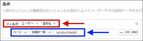 次に「商品・サービス詳細ページ閲覧した」という条件は、「ページ」「先頭が一致」「/product/detail/」などとする(図6青枠部分)。このディレクトリ名の部分は、どのページが「商品・サービス詳細ページ」なのかは各サイトで異なるので、自分のサイトのURL構造にあわせてふさわしい設定内容に修正してほしい。