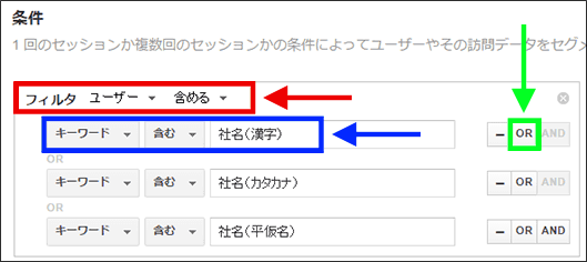 図7の例では、社名の漢字の一部を含む言葉を使って、「キーワード」「含む」「社名(漢字)」とまず指定(図7青枠部分)し、その右側の「OR」(図7緑枠部分)をクリックし、さらに「カタカナ社名」や「平仮名社名」の一部を指定するなどしよう。