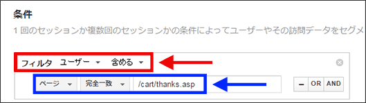 その下は購入完了ページを閲覧したという意味で、「ページ」「完全一致」「/cart/thanks.asp」と指定する(図8青枠部分)。ここは自分のサイトの購入完了ページを指定してほしい。