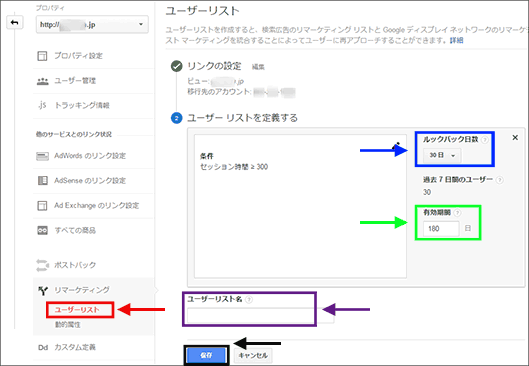 あとは、ユーザーリストに名前を付けて(図9紫枠部分)、「保存」(図9黒枠部分)する。同様にして対象のセグメントをユーザーリスト化すれば、AdWords側でリマーケティングリスト用のユーザーリストとして選択できるようになる。