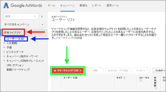 最後にAdWordsのリマーケティングリストの組み合わせ条件を作成する方法を説明しよう。キャンペーンの中の共有ライブラリ(図10赤枠部分)の中にある「ユーザー リスト」(図10青枠部分)をクリックすると、図10の画面になる。