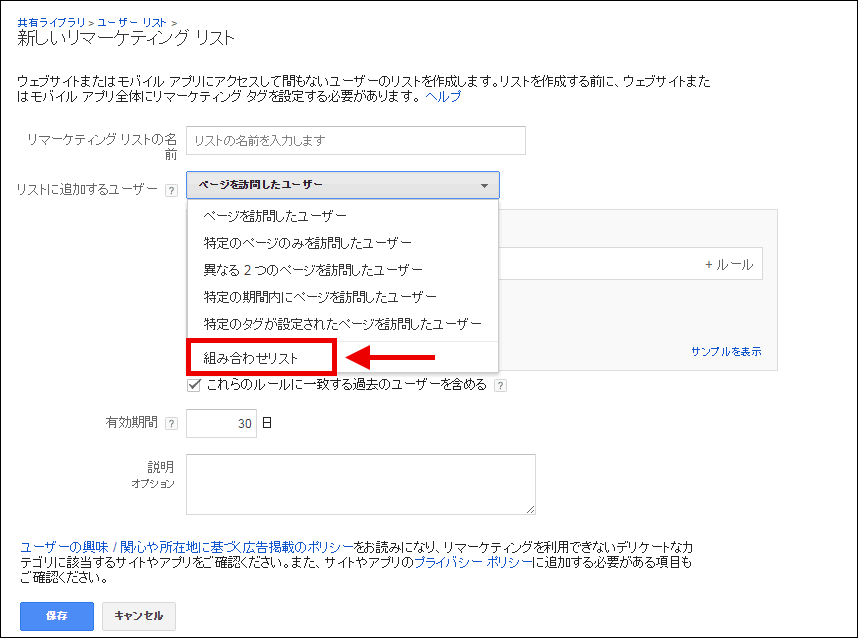 各セグメントを作成したら次はユーザーリストの作成だ(図9)。アナリティクス設定のユーザーリストの定義(図9赤枠部分)で、「ルックバック日数」と「有効期間」を指定する。