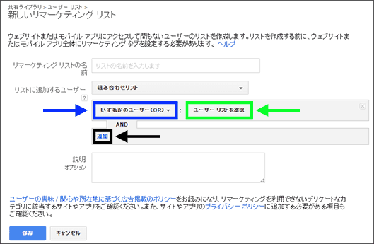 条件は「OR」か「AND」か「NOT」で組み合わせることができる。ここでは単純にAからDまでのリストを「OR」で足し合わせる設定例を最後に紹介しよう。 図13青枠部分で表示されている「いずれかのユーザー(OR)」が、「OR」条件の指定なのでそのままとし、その右側の「ユーザーリストを選択」(図13緑枠部分)をクリックして出現するユーザーリスト群から、AからDまでに対応したリストをすべて選択して「OK」ボタンをクリックする。そうすると、図14のような表示になり、4つのリストの「OR」条件になるというわけだ。