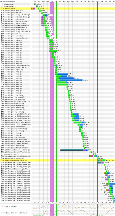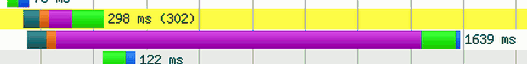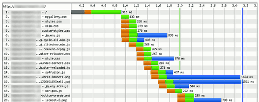 オレンジ色は、サイトに対して行われる初期TCP接続を示す。TCP接続の確立が必要なのは、最初にそのホスト名に対して数件のリクエストだけで、その後は既存の接続が再利用される。図中に多くのオレンジ色がある場合は、サイトが持続的接続(KeepAlive)を用いていないということだ。