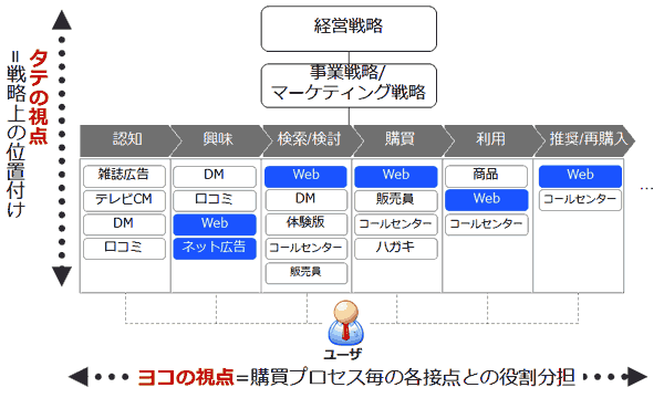 まず大事なのが、Webとそれ以外の顧客接点のなかで、Webにどういった役割を持たせるかを明確にすることです。お客様は自社のWebサイト以外にも、テレビCMや交通広告、パンフレット、お店の店員やコールセンターのオペレータなど、さまざまなチャネルにも接触しています。サッカーに、ディフェンダー、ミッドフィルダー、フォワードという選手の役割分担があるように、お客さまと接するチャネルにも役割があるのです。