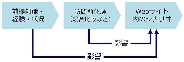ユーザがみなさんのWebサイトを訪れた際の「状況」が、Webサイトの使い方や見方にすごく影響をします。たとえば、急いでいてパッと要点を調べたいだけなのか、細部まで詳しく吟味したいかでWebサイトの見方も変わります。そういう「状況」も考慮したストーリーの仮説をつくるのです。