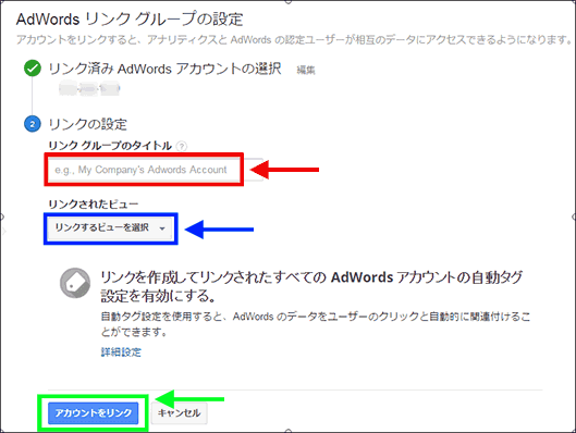 図3の画面ではリンクグループの名前を付けて(図3赤枠部分)、連携したいビューを選択する(図3青枠部分)。複数選択可なのでここでユーザーリストの抽出に必要なビューはすべてチェックを入れておこう。それから「アカウントをリンク」(図3緑枠部分)をクリックする。