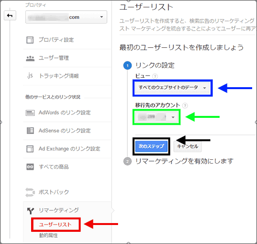 まずはGoogleアナリティクスのアナリティクス設定ページを開き、example.comドメイン名を計測しているプロパティ(図1赤枠部分)の項目にある[リマーケティング]>[ユーザーリスト](図1青枠部分)をクリックしよう(図1)。