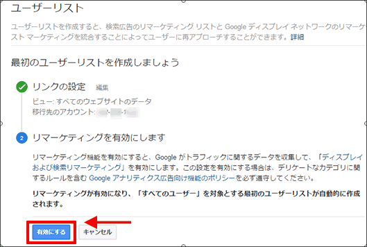 「移行先のアカウント」は、先ほど連携したGoogle AdWordsアカウント(図4緑枠部分)を選択して、「次のステップ」(図4黒枠部分)をクリックする。あとは次の画面(図5)で「有効にする」(図5赤枠部分)ボタンをクリックしよう。