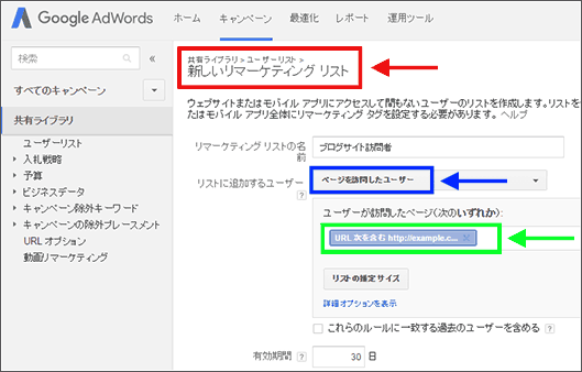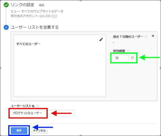 同様にして、本サイト(サービス申し込みサイト、eコマースサイト)の方のexample.jpドメイン名訪問ユーザー全員のユーザーリストを、「本サイトのユーザー」などという名前で作る。こちらのユーザーリストに対しても、先ほどと同じ有効期間を指定しよう。