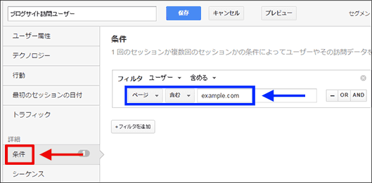 たとえばブログサイト訪問者のリストは、プルダウンから「ページを訪問したユーザー」を選択(図9青枠部分)し、ユーザーが訪問したページの条件は、「URL」「次を含む」「http://example.com/」(図9緑枠部分)とすればよいだろう。