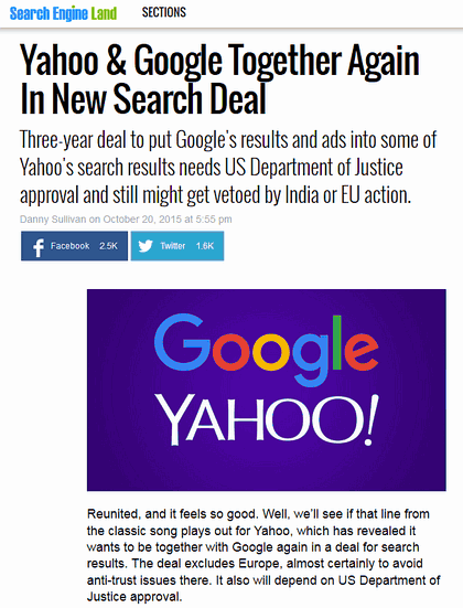 ただし提携したとはいえ、(米国の)司法省が許可しないかもしれない。検索市場におけるグーグルの影響力が大きくなりすぎるからだ。ヤフーとグーグルの提携話が過去にも出たことがあるが、そのときは司法省が認めず、結局は実現しなかった。