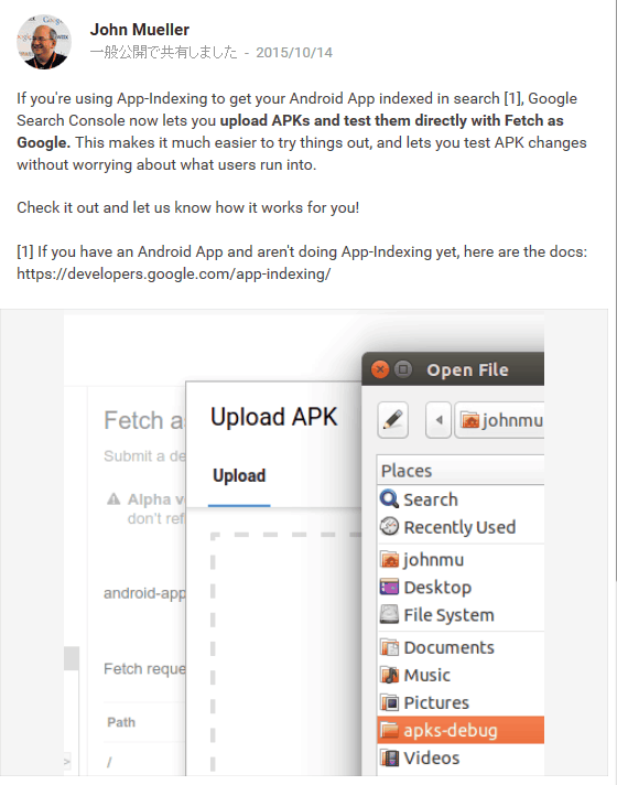 このアプリ向けのFetch as Googleが改良され、APKファイルをアップロードすることでも検証できるようになった。APKファイルを直接使用すれば、アプリを更新した場合でも公開する前に問題がないかどうかを確かめられる。