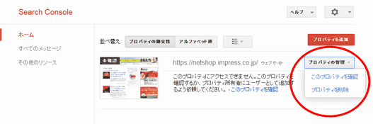 Search Consoleのダッシュボードで、いま追加したサイトの「プロパティの管理」を選んでから、「このプロパティを確認」を選択する。