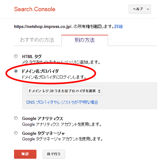 Search Consoleのダッシュボードで、「プロパティの管理」を選んでから、「このプロパティを確認」を選択する。「ドメイン名プロバイダ」が「おすすめの方法」に表示されない場合は、「別の方法」タブを見てほしい。