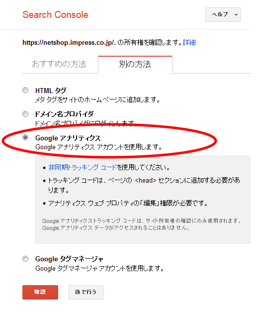 Search Consoleのダッシュボードで、「プロパティの管理」を選んでから、「このプロパティを確認」を選択する。「Google アナリティクス」が「おすすめの方法」に表示されない場合は、「別の方法」タブを見てほしい。「Google アナリティクス」を選ぶと、作業に必要な条件が表示される。