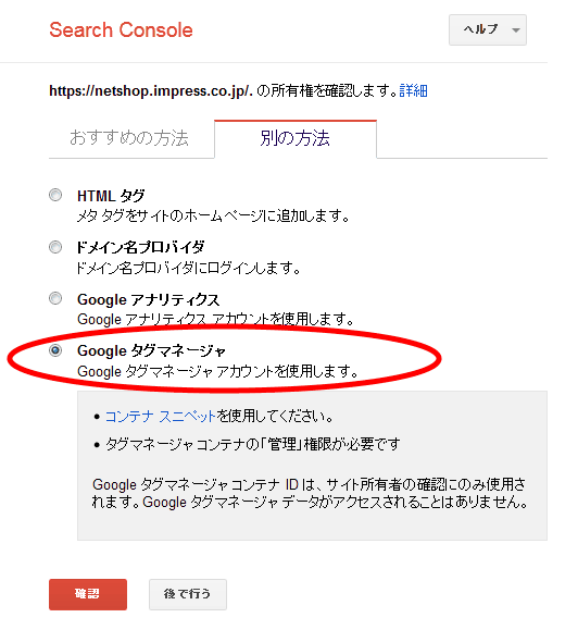「Google タグマネージャ」を選択して「確認」をクリックする。GTMのコードが記述されていれば、あなたのサイトが確認されたことを知らせる画面が表示される。