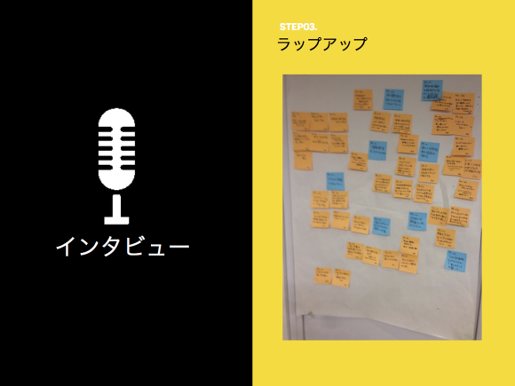 「ラップアップ」と呼ばれる分析は、まず、インタビューノートを付箋化(オレンジの付箋)し、壁の模造紙に貼っていく。そして、その付箋の中から、対象者の内面に関わりそうな要素(メンタルモデル)を抽象化し、青い付箋に書き出していく。
