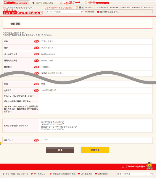 今回「惜しい!」確認ページとして紹介するのは、株式会社ロッテ様(以下、ロッテ) オンラインショップ新規会員登録フォームの確認ページです。