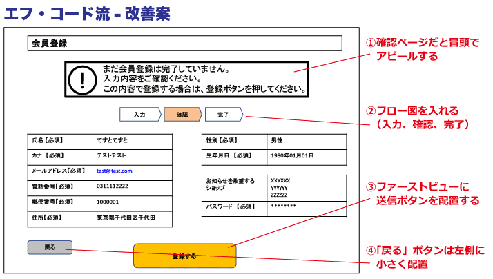 フロー図があれば、ユーザーがいまどのページにいるかが一目瞭然です。もし入れていない場合は、確認ページだけではなく、入力、確認、完了の各ページに一貫してフロー図を入れる必要があります。