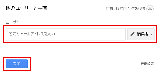 個別の相手に指定して共有したいときは、相手のGoogleアカウントのユーザーを追加して、「編集者/コメント可/閲覧者」のどれかの権限を選択して、「完了」をクリックすると、共有したい相手に招待メールが届きます。