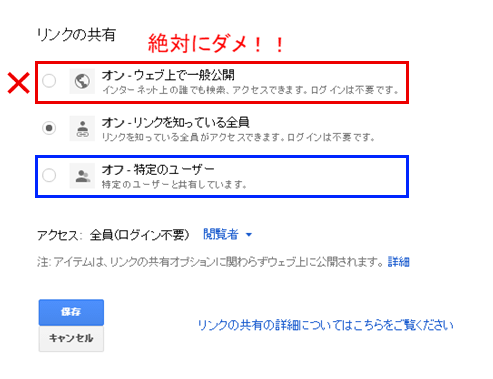 リンクを知っている全員への共有をやめたたいときは、右下の詳細設定で設定できます。ただし、一般公開(下記赤枠)を選択してしまうと大変なことになるので、絶対に選択してはいけません。