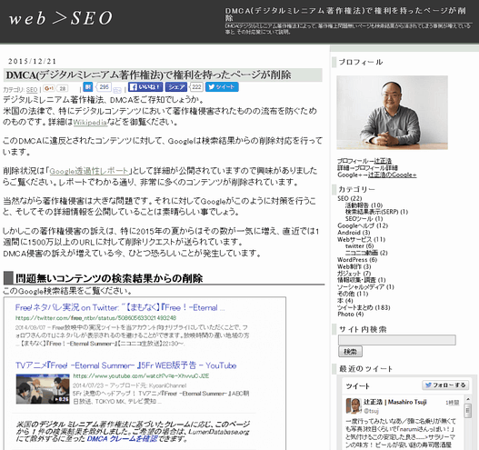 正当な著作権をもって公開しているコンテンツであるにもかかわらず、何者かが「権利侵害である」と主張したことで、グーグルなどで検索しても出てこない状況が発生してしまっているようだ。SEOコンサルタントである株式会社so.laの辻正浩氏が実例を出して指摘している。