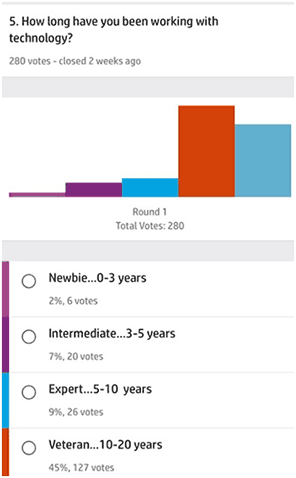 結果:投票総数280。一番多かったのが10~20年の「ベテラン」で、ついで20年以上の「マスター」。比較的経験者が多く集まるカンファレンスでした。