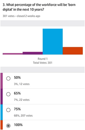 質問:皆さんは今後10年の間で全労働人口に占める「デジタル時代に生まれた(Born digital)」世代の割合は%になると思いますか?