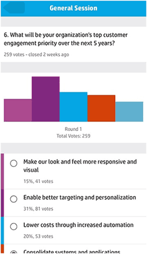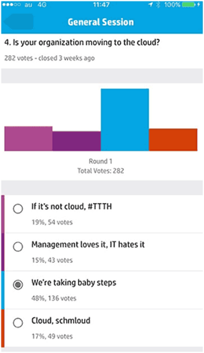 実際に各セッションが始まる前に、このアプリを使ったリアルタイム投票が行われました。そこで、会場で出された質問の一部とその結果を紹介します。