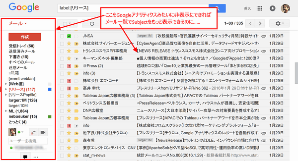 Gmailって、左側のサイドバーが邪魔なときがあるんですよね。リリースメールを一気にチェックするときなんか、「あの領域がなければ、もっとsubjectや本文の冒頭を確認しやすいのに」と思うことがしばしば。