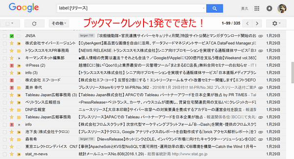 あとは、Gmailを表示している状態で、ブックマークからこのブックマークレットを選ぶだけです。