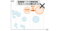 という状況だった。ボリュームゾーンは(d)である。ここに対策を打てば、効果が大きいだろうということがわかる。このケースでは、「商品カテゴリで検索して流入したランディングページから離脱しているユーザーは、他社サイトに比較しに行っているのではないか、価格で比較されて他社に流れているのではないか」と予想した。そこで、自社に有利な比較の軸を提示し、他サービスとの比較をあえて促し、再訪するようなコミュニケーションを設計した結果、コンバージョン率が2倍になった。