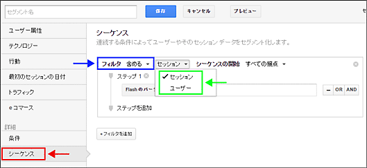 この例でわかるように、「シーケンス」分類の場合でも、他のセグメントと同様に「ユーザーベース」と「セッションベース」の2つのフィルタがある。