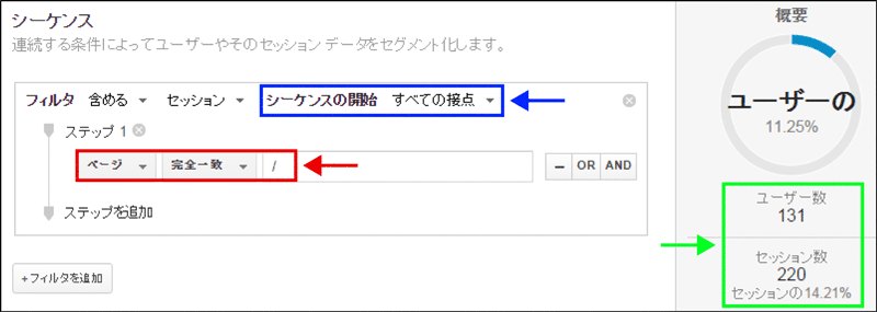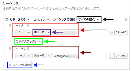 - 「セッションベース」は、1訪問(セッション)内での利用行動の順番を指定できるセグメント