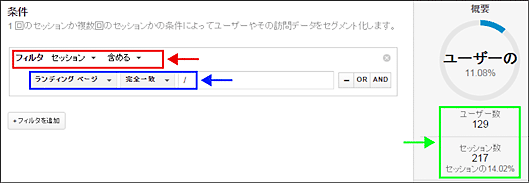 図5は「条件」分類の画面で、ランディング ページがトップページ(図5青枠部分)の「セッションベース」(図5赤枠部分)のセグメント条件だ。