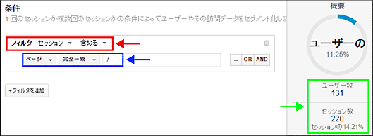 図7は「条件」分類の画面で、トップページを閲覧した(図7青枠部分)「セッションベース」(図7赤枠部分)のセグメント条件だ。
