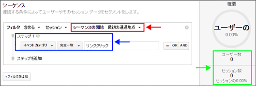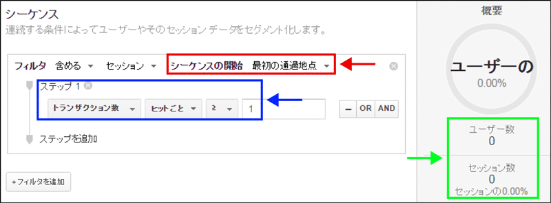 特殊なケースを除けば、通常セッションは「ページビュー」ヒットが最初に発生するので、「イベント」や「トランザクション」が「最初の通過地点」になることは稀だろう。よって、シーケンスの開始を「最初の通過地点」にした場合(図8赤枠部分、図9赤枠部分)に、「ステップ1」にイベント系の「イベント カテゴリ」(図8青枠部分)や、トランザクション系の「(ヒットごとの)トランザクション数」などを指定(図9青枠部分)してもゼロにしかならない(図8緑枠部分、図9緑枠部分)が、注意点はそれくらいだろう。