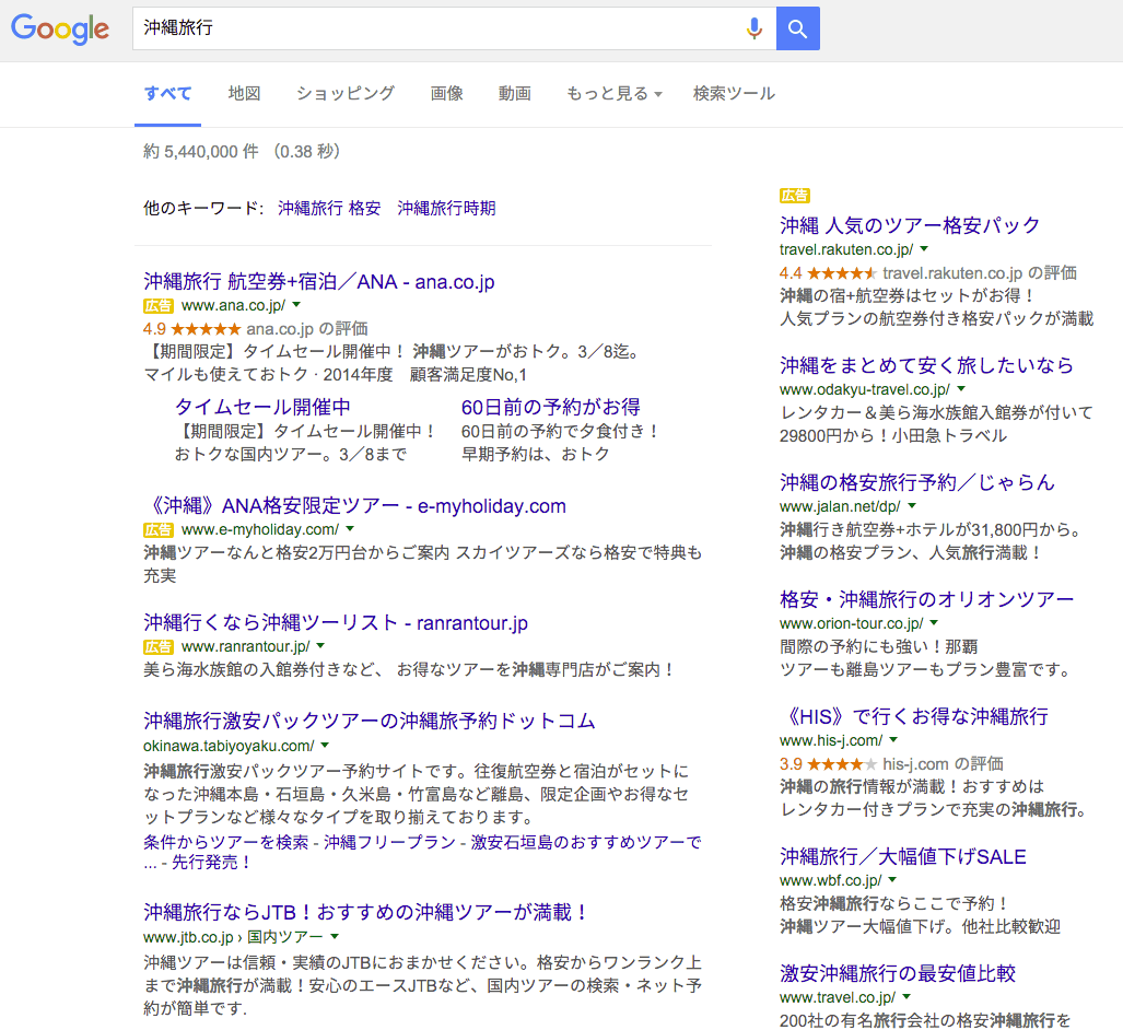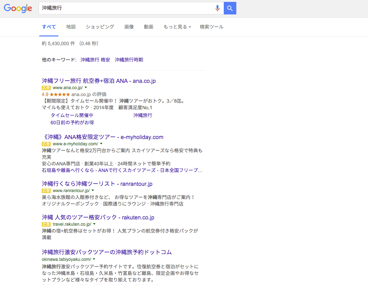 今までは、検索結果の上と下、そして横(右側)にアドワーズ広告が表示されていた。これからは、上と下だけになる。つまり右側のエリアにはアドワーズ広告はもはや表示されない。