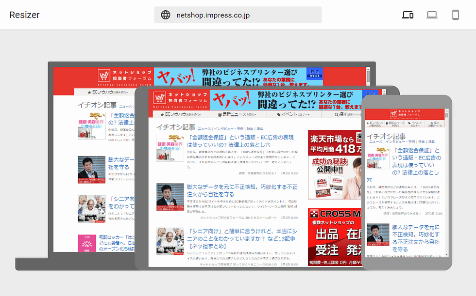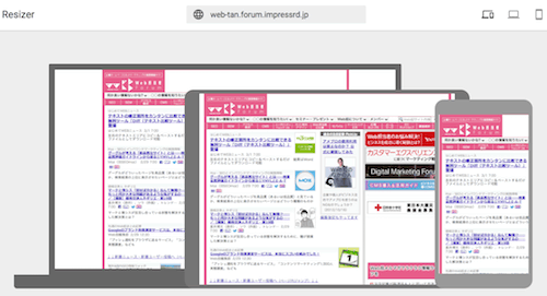 Resizerは、PCとタブレット、スマートフォンそれぞれでウェブページがどんな風に見えるかを、1画面でまとめてシミュレーションできるオンラインサービスだ。