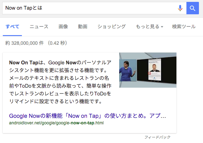 グーグル検索は、ウェブページのリンクの一覧ではなく、検索結果そのものでクエリに対する回答を返すことがある。“Featured Snippets”(フィーチャード・スニペット)と呼ばれる仕組みだ。フィーチャード・スニペットは、クエリに対する回答の抜粋とともに、その抜粋の引用元ウェブページのリンク先URLを掲載することが多い。