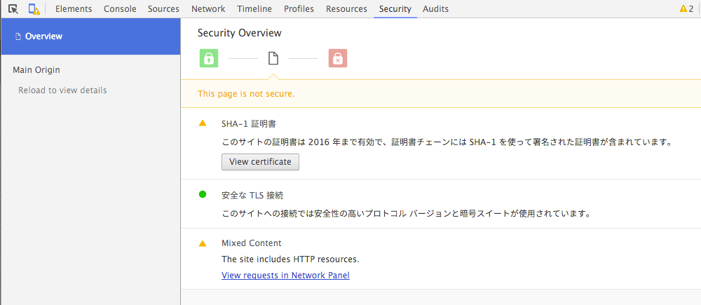 Chromeでは、正常なHTTPSページには緑色の鍵マークがURLの前に表示される。表示されていない場合は、なんらかの問題がある。セキュリティパネルで調査するといい。HTTPS移行の際に重宝しそうだ。
