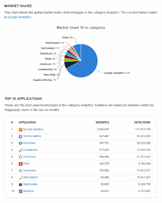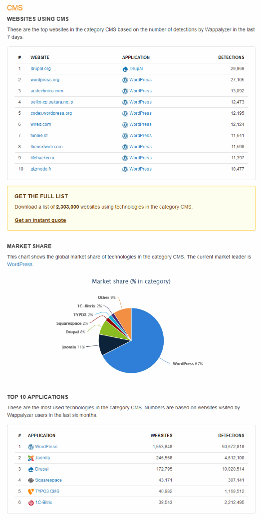 Wappalyzerサイトには、このツールで取得したデータから、各カテゴリでどのシステムがよく使われているかの情報も掲載されています。