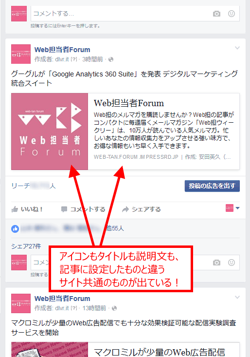 また、元記事のタイトルやアイコンを変えたのに、Facebookでシェアするときの表示が前のままということはありませんか?