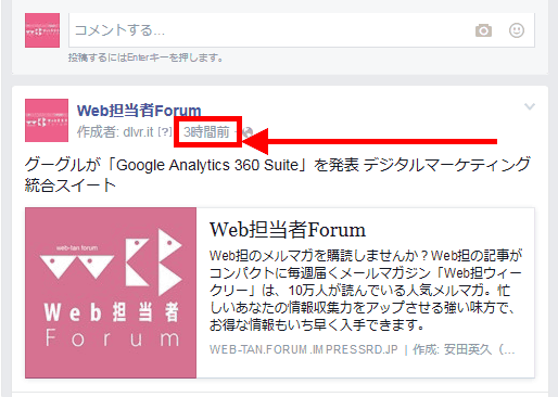 まず、タイムラインではなく、シェアの個別ページに行きます。日付の部分をクリックしましょう。