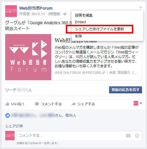 本来は、この「キャッシュ」を更新するにはFacebook Debuggerを使わなければいけないのですが、この[シェアした添付ファイルを更新]では、それと同じ動作をしてくれるようです。