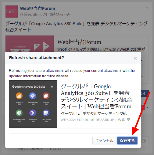 すると、Facebookが改めてOGPをチェックしてくれるので、正しいものが表示されていることを確認して[保存する]をクリックします。